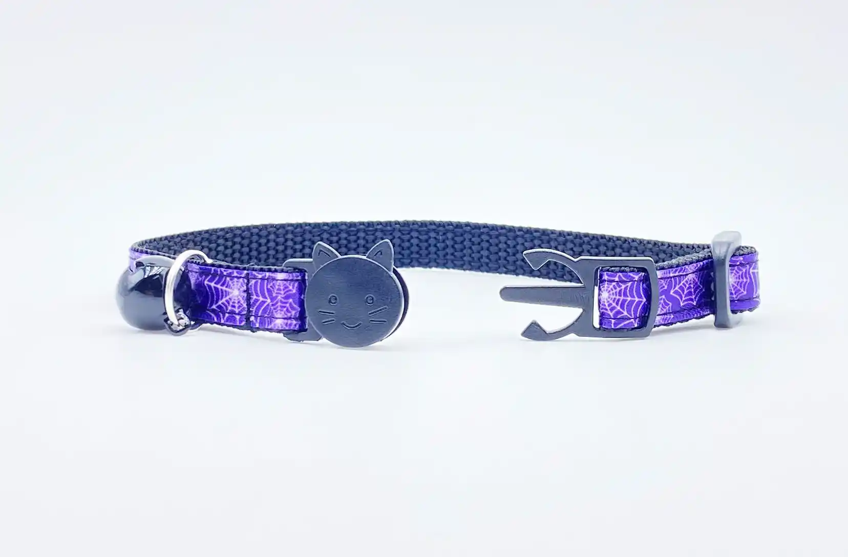 This spooky Halloween cat collar is crafted using only high quality, strong and durable fabrics and materials. With its quick release black cat face safety buckle, this fun collar with white spiderweb ribbon is fully adjustable with a black bell and adjuster.