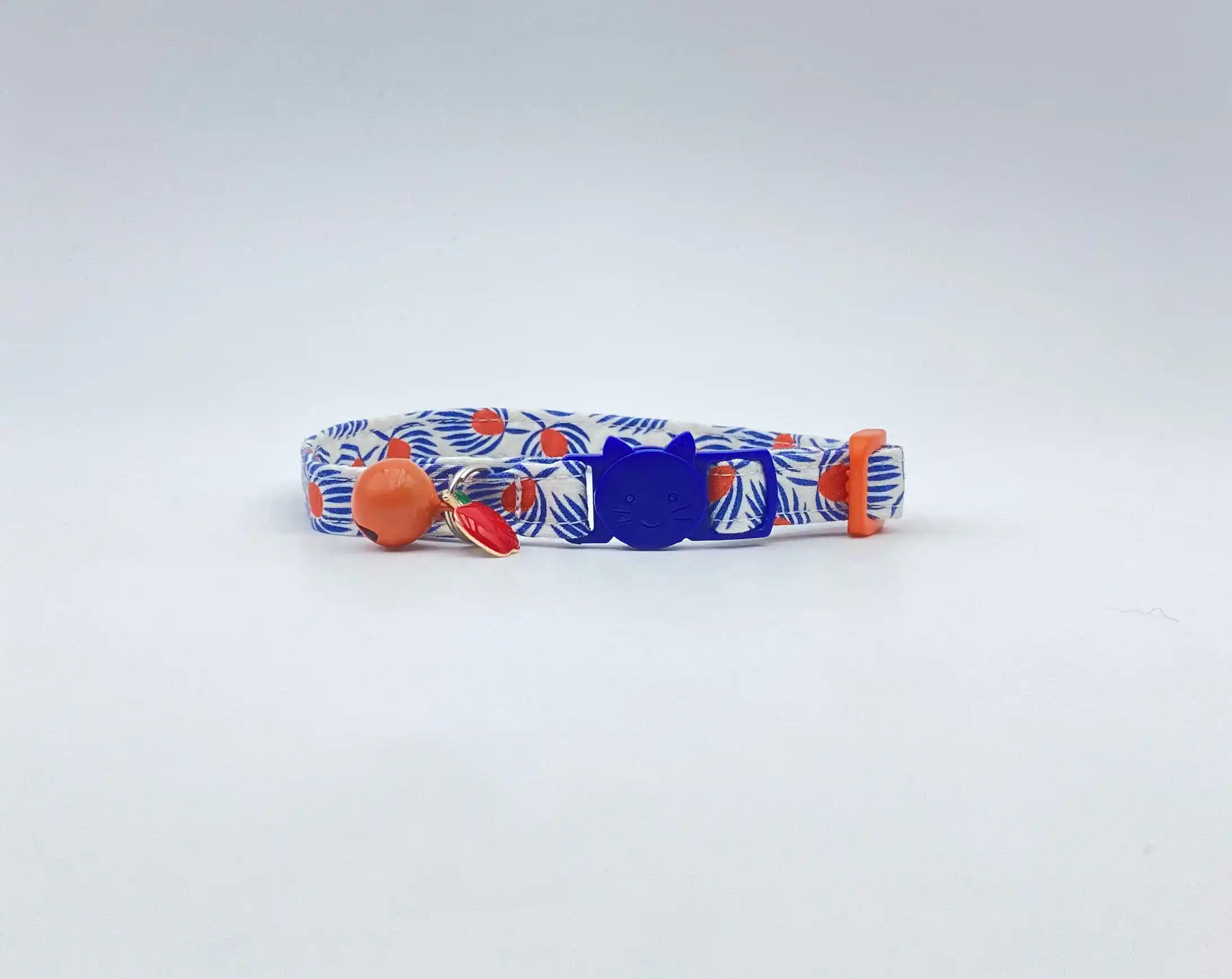 This fabulous unique cat collar is crafted using only high quality, strong and durable fabrics and materials. With its quick release dark blue cat face safety buckle, this beautiful collar has a orange and blue tones and is fully adjustable. Accessorise with a orange plastic moulded tri-glide [adjuster] a orange jingle bell and cute apple charm.