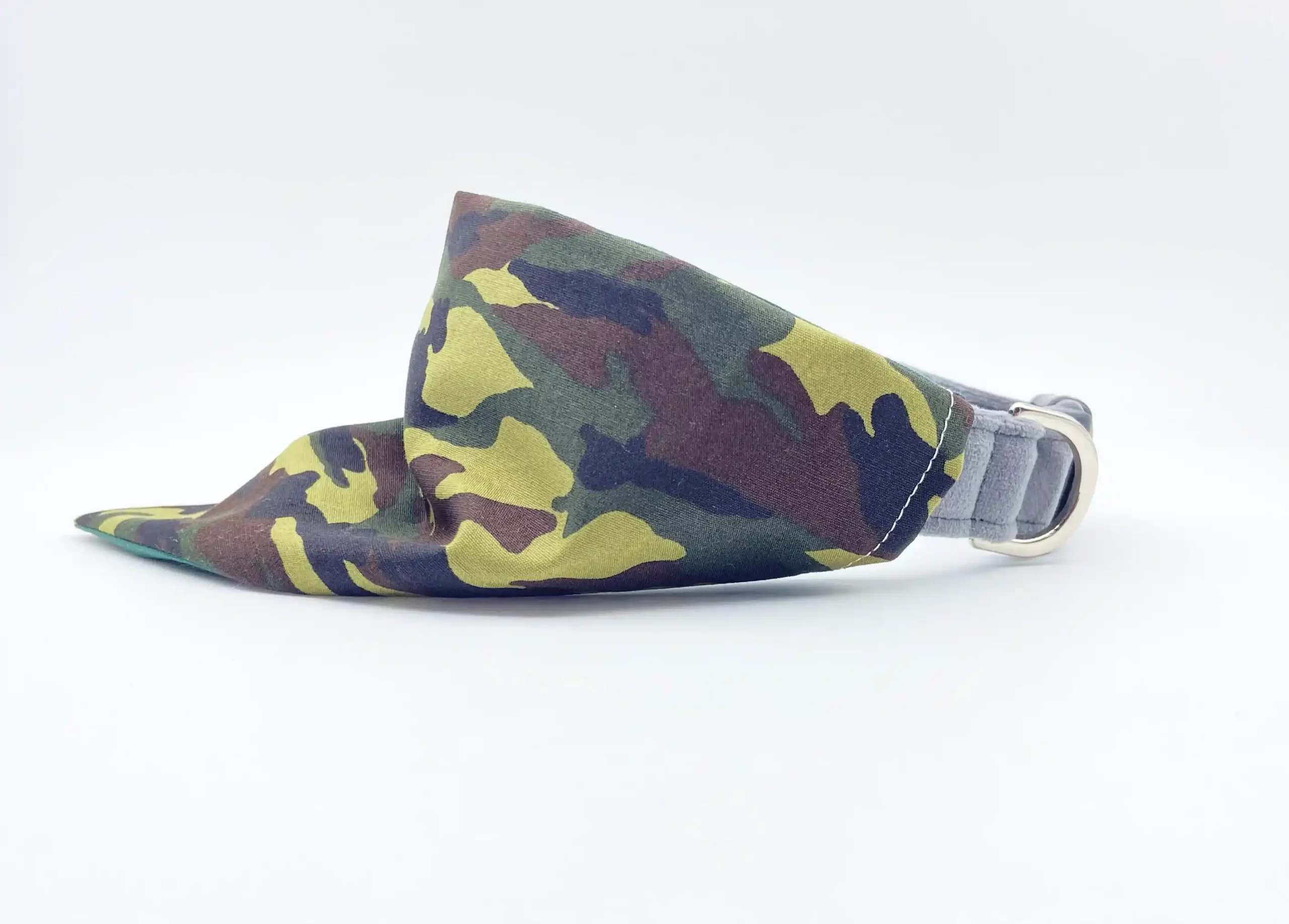 Charcoal Grey Velvet Velour Collar shown in the picture and is sold separately – All of our dog bandanas are designed to allow the collar to slip through and are easily attached