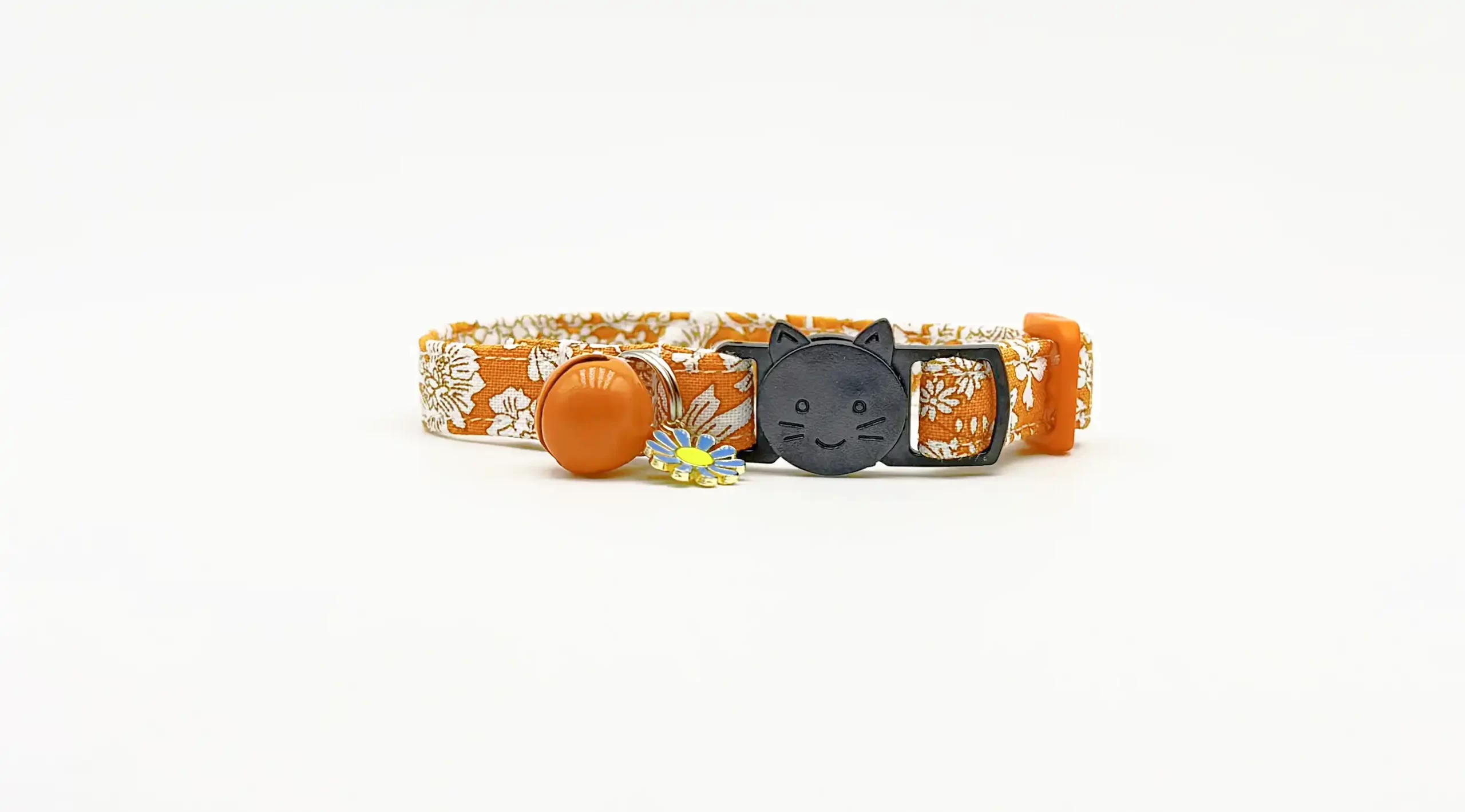 Crafted using only high quality, strong, durable, black cat face quick release buckle, orange plastic adjuster, flower charm [colour may vary] & orange jingle bell