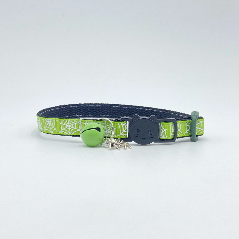 Black quick release cat face safety buckle with rounded ears, Lime ribbon with white spiderweb design, dark green adjuster and light green jingle bell