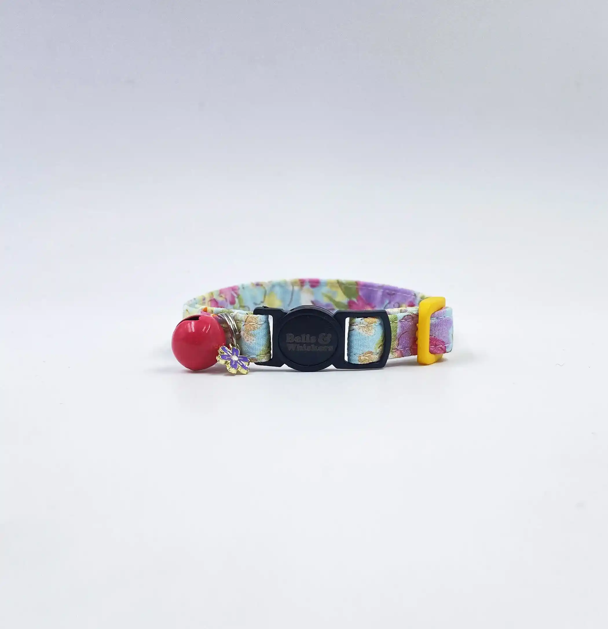 Crafted using only high quality, strong, durable black cat face quick release buckle, yellow plastic adjuster, pink cat bell and a cute flower charm [colour may vary]