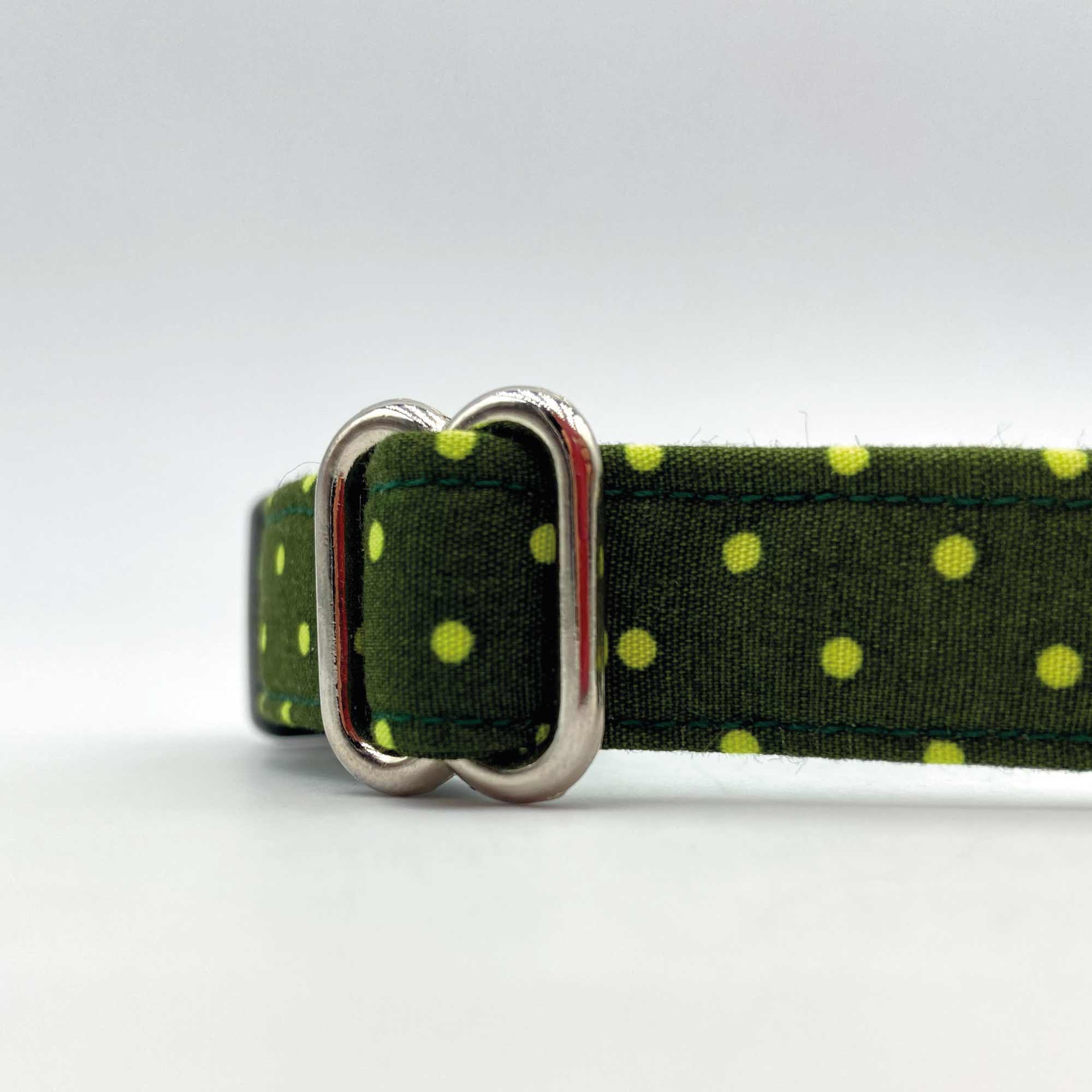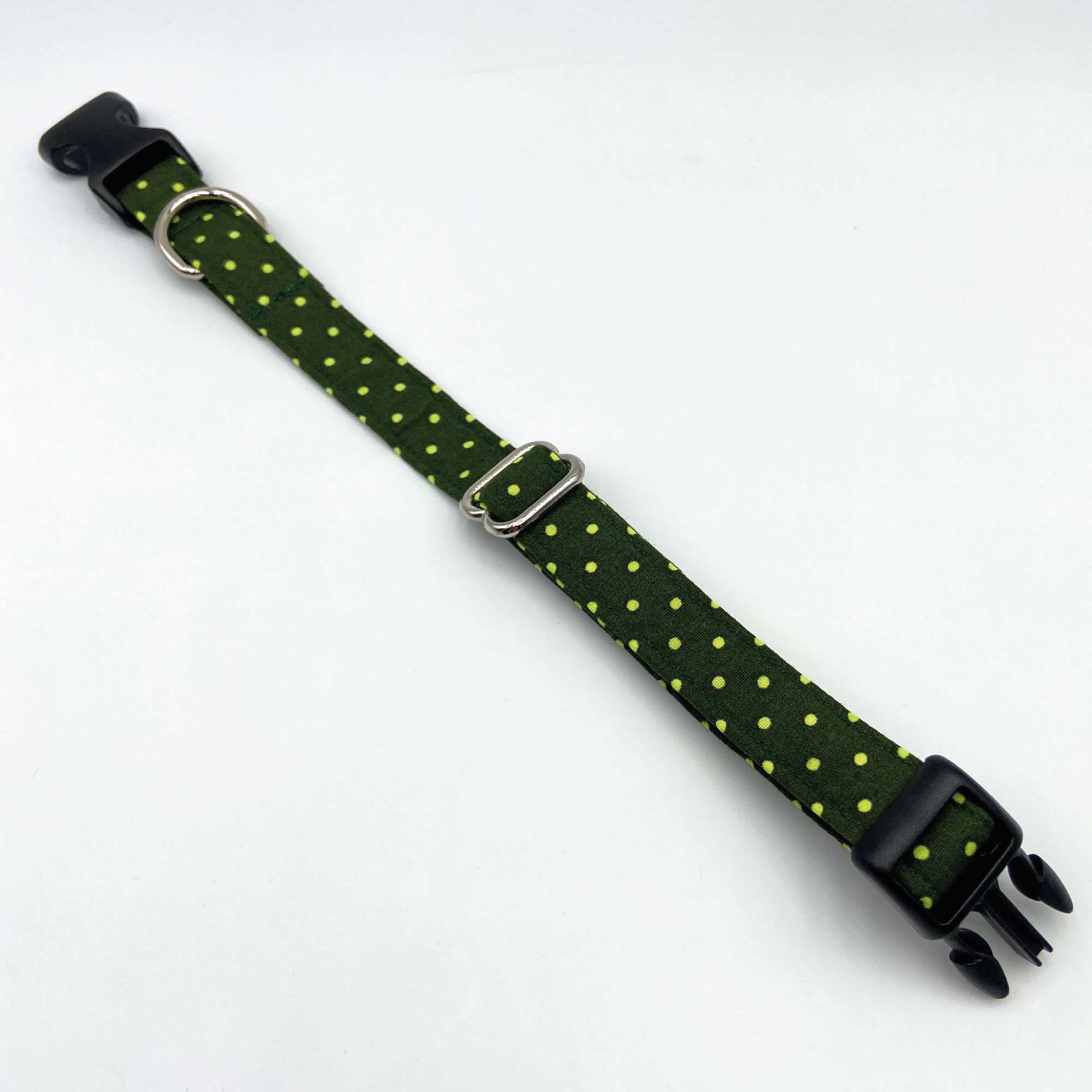 Puppy and small dog Size 18cm – 28cm / 7″ – 9″ in Olive Green, yellow polka dot collar with Nickel Plated D-Ring & matching adjuster with secure black plastic branded buckle.